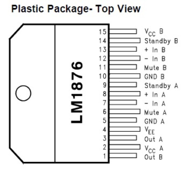 Description: The LM1876 is a stereo audio amplifier capable of delivering typically 20W per channel of continuous average output power into a 4Ω or 8Ω load with less than 0.1% THD+N.